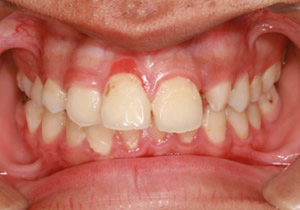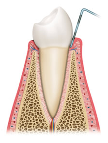 This picture shows the collection of plaque around the tooth. When plaque is not removed by proper brushing and flossing, inflammation of the gum tissue develops causing the formation of a pocket.